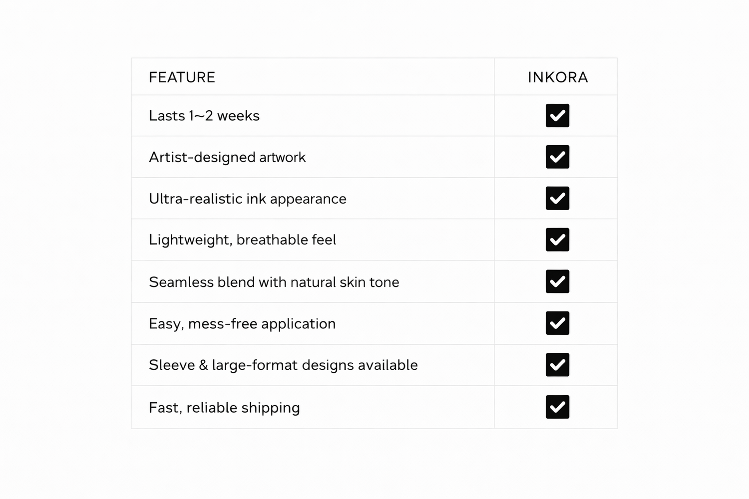 From first application to final fade, Inkoraâ„¢ tattoos deliver a natural appearance and comfortable wear. Crafted with skin-friendly materials and artist-led designs, every piece blends seamlessly with your skin.