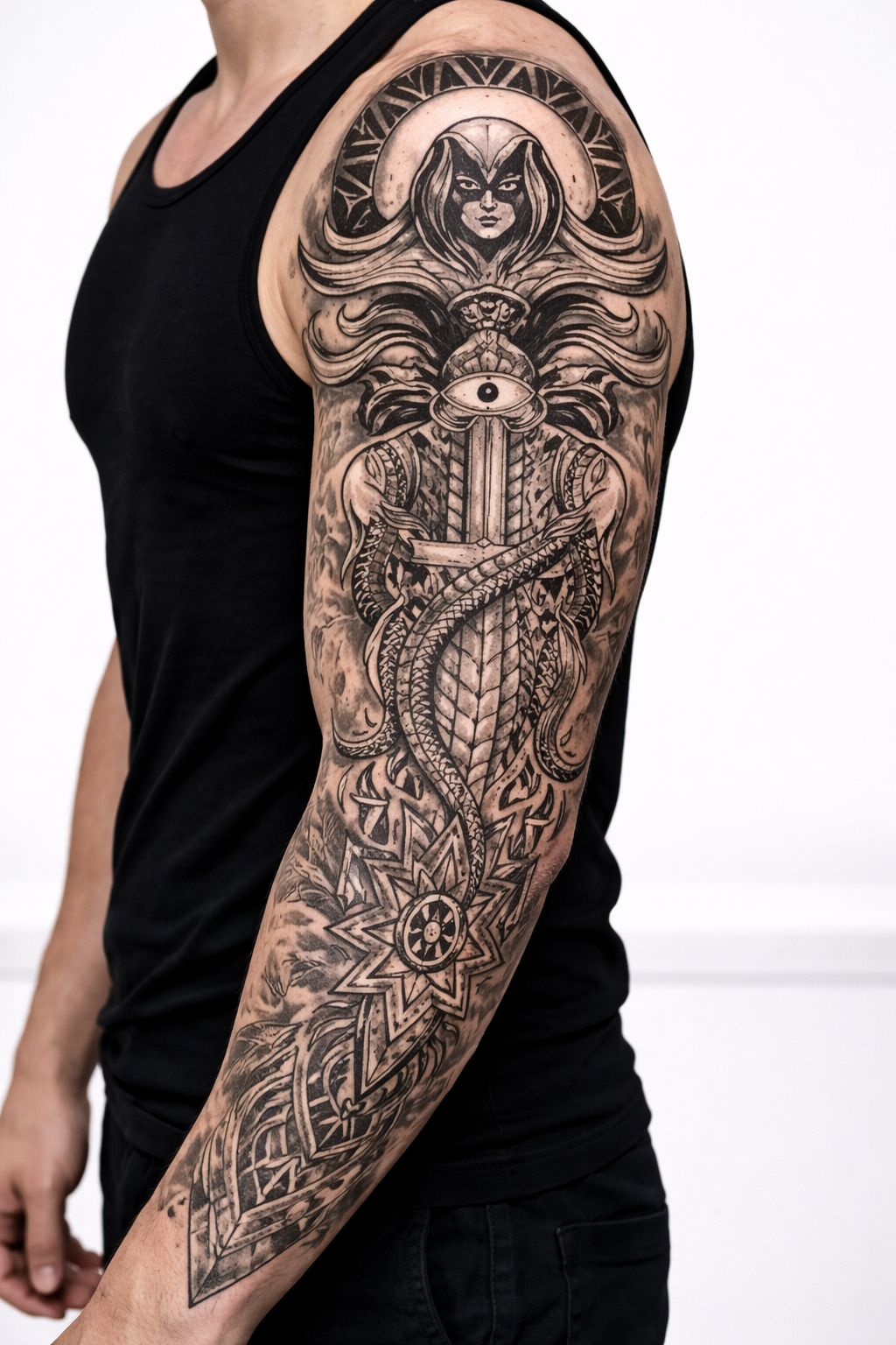Venom & Balance. Ultra-realistic temporary tattoo designed for bold statement wear.